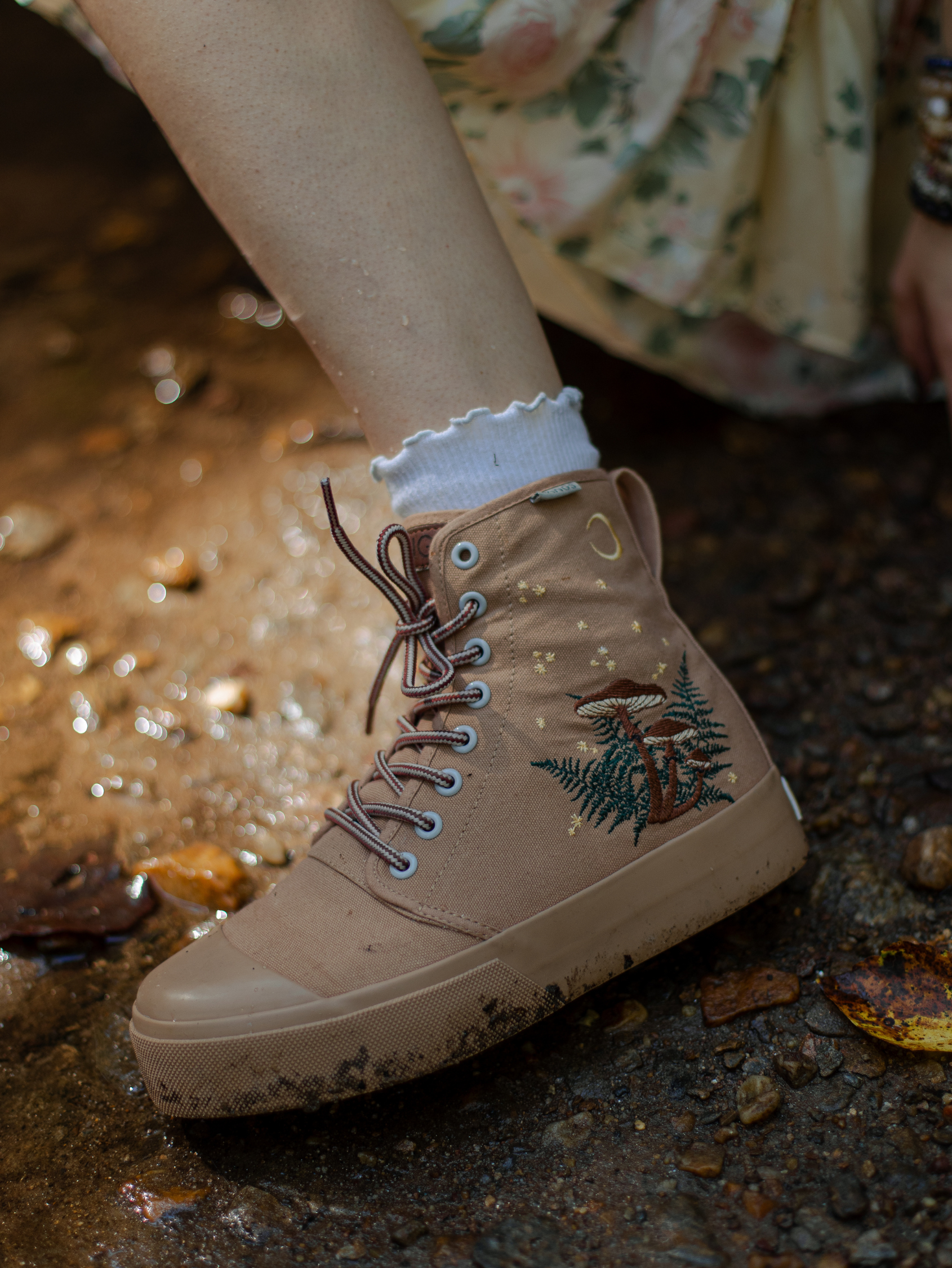 This stunning shoe is a fully embroidered design created in collaboration with Hannah Drapinski. The sole is 1.5 inches (our normal shoes have 0.9 inch soles) and the high top part around your ankle is ~ 1 inch higher than our normal high tops. This canvas is our Zion Sand khaki color.